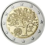 The edge of the coin is decorated with twelve stars, representing the twelve stars of the flag of the European Union. These stars symbolize unity and solidarity between European nations. Furthermore, the details of the engraving show great precision, illustrating the importance of this commemorative issue.