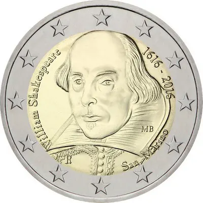 In 2016, the Republic of San Marino issued a two-euro commemorative coin to celebrate the 400th anniversary of the death of William Shakespeare, a prominent English writer. Born in 1564, Shakespeare is known for his many theatrical and poetic works that have left their mark on world literature. Therefore, this coin honors the memory and lasting impact of Shakespeare on culture and literature.